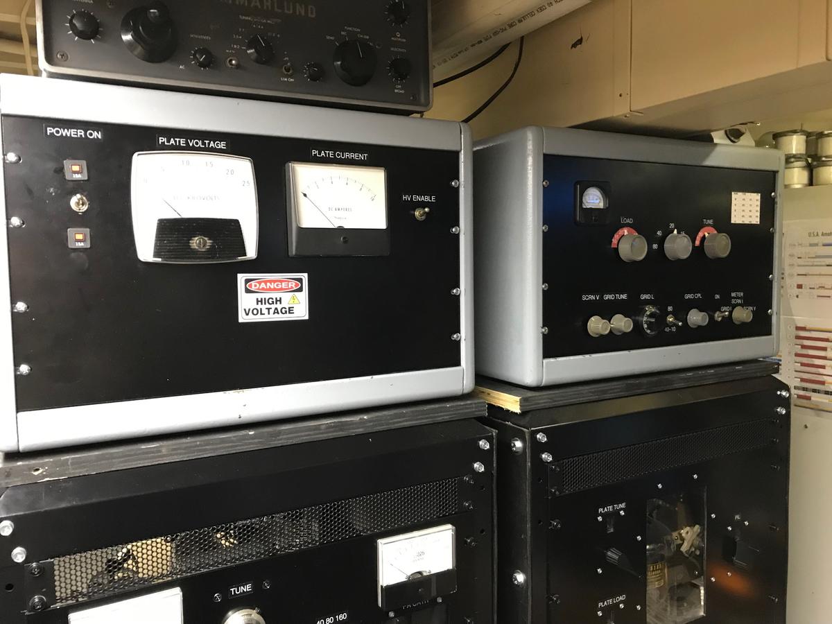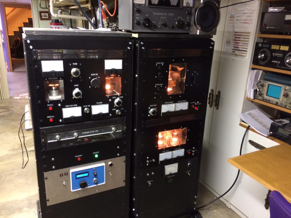 As you can see, I enjoy building and AM. The rig on the right in the black 4 foot rack is a pair of 813s plate modulated by a pair of 4-250s in class AB1 (80-20.This rig started out in 2012 as a pair of Russian GI7Bs modulated by another pair of GI7Bs. Jim Isom (KJ9T) called it "The Ruskie". Now it's the "neutered" Ruskie. The taller rig on the right is a pair of 304THs in push-pull plate modulated by a pair of beautiful 304TLs in class AB1. This transmitter works on 160, 80 and 40. The two rigs on the left are a 4-400 (160-40) plate modulated by a pair of 813s in class AB2 and a 4-1000 (80-20) plate modulated by a pair of 4-400s in class AB1. I do a little SSB work with the old TS-520. It drives an old Dentron MLA-2500 that I retrofitted with a pair of GI7Bs. Latest addition is a pair of 4CX250Bs screen modulated by a single 6L6. Built in two DX-100 cabinets. One is the 2KV power supply and the rest of the rig is in the second cabinet.